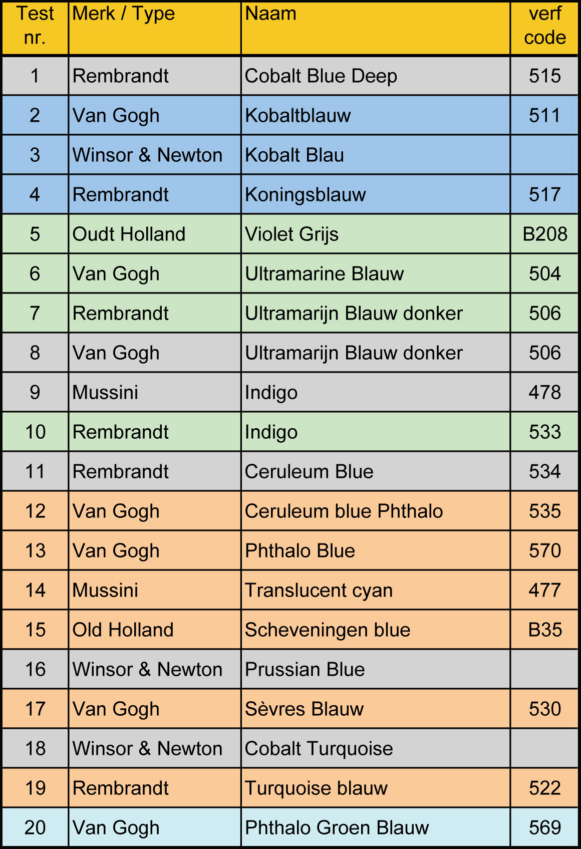 - ceruleumblauw (nr. 534 / PB28 – Cobaltus alimunate).