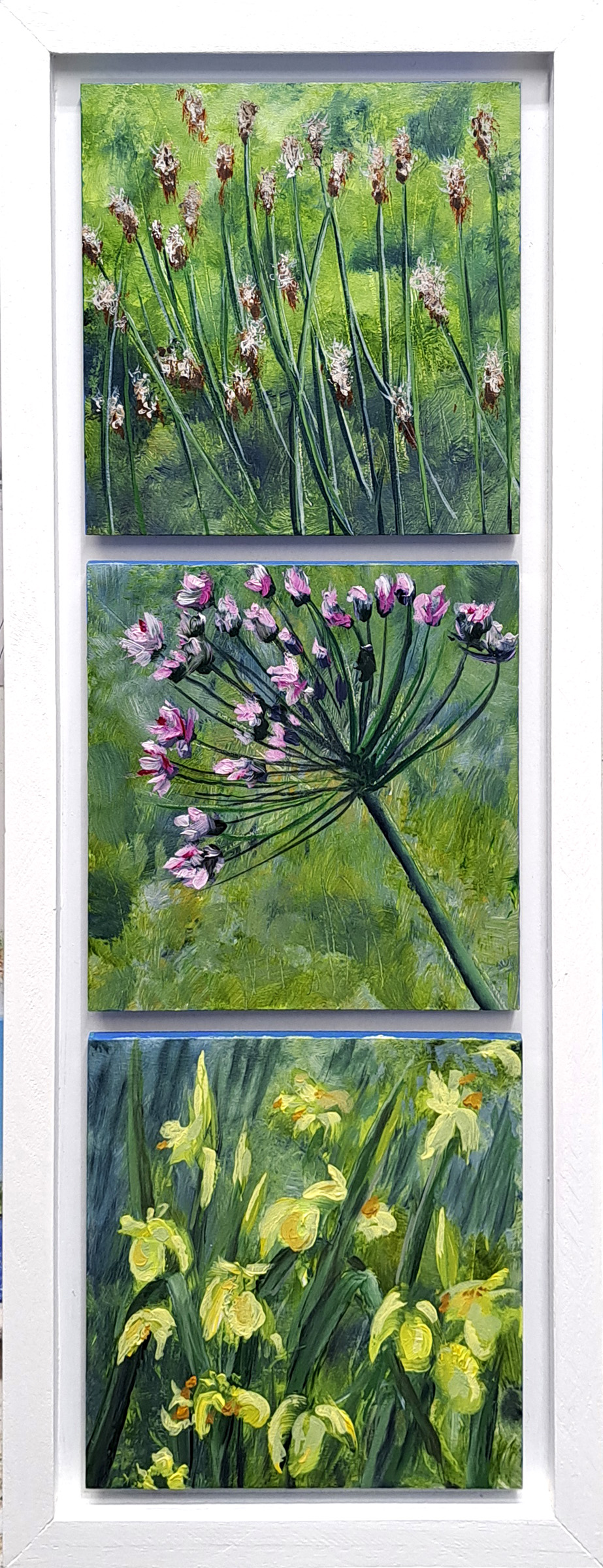 Detail: De randen van deze schilderijtjes zijn rondom blauw geschilderd. Van opzij gezien geeft dat een leuk kleureffect. Van voren zie je het terug in de kleur van de slagschaduw in de witte baklijst.